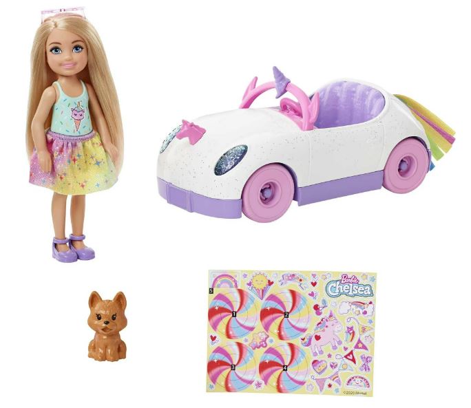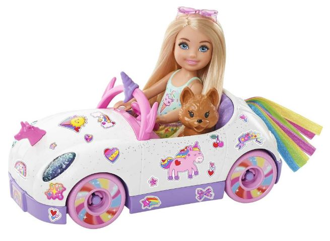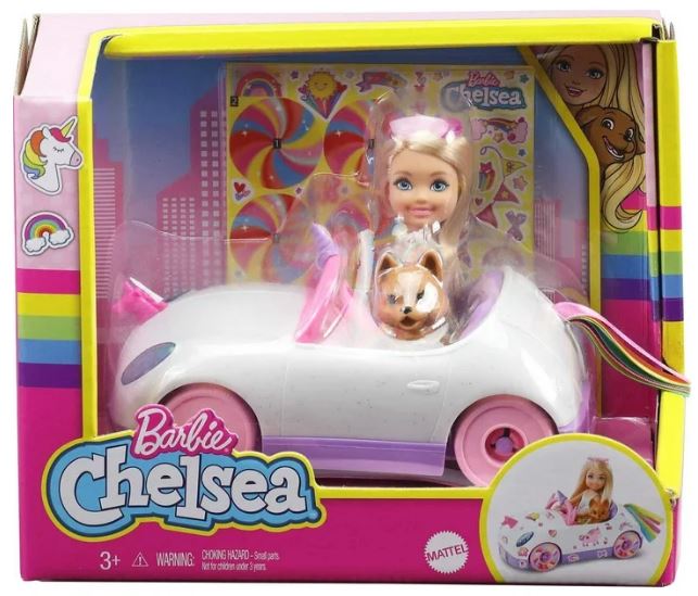 Chelsea doll is ready for any adventure in a unicorn-themed molded top, removeable tie-dye skirt, silvery shoes and adorable pink sunglasses. With so many sweet details, this Chelsea doll and car playset makes a great gift