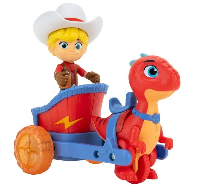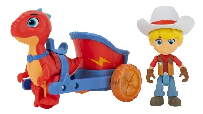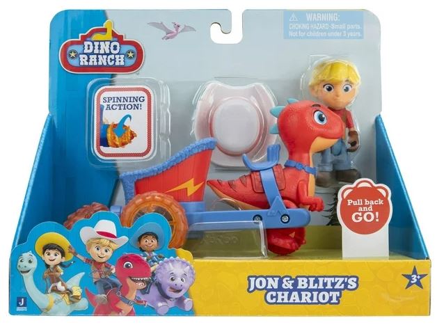 This fun vehicle features a pull back 5″ Dino vehicle with Blitz and the 3″ Dino Rancher, Jon, with a removable hat. Jon and his best friend Blitz, the speedy velociraptor, are one of the fastest duos on Dino Ranch! In this feature vehicle, Blitz is equipped with a colorful chariot with a neat lightning bolt on its side. Watch Blitz speed through when you pull the chariot back! The flames spin, too! There are three styles to collect: Min & Clover with attached Care Cart, Jon & Blitz with attached Chariot, and Miguel & Tango with attached Tow Rig.